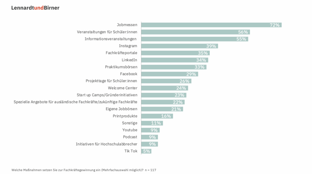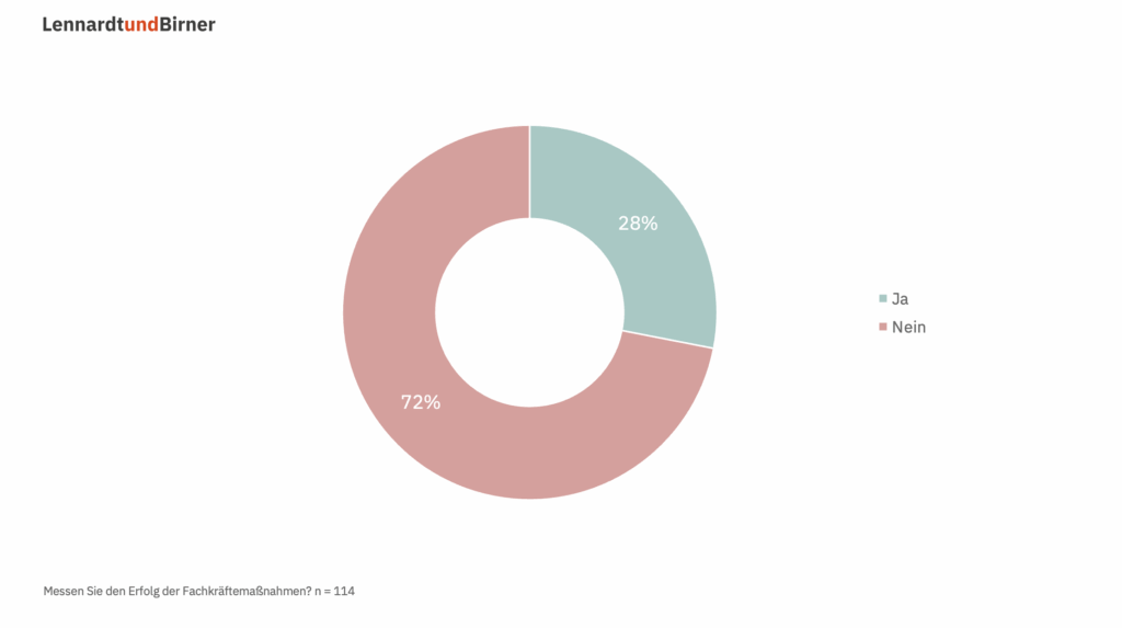 Jobmessen und Informationsveranstaltungen (für Schüler:innen) werden am meisten für die Fachkräftegewinnung genutzt. Aber die Mehrheit misst den Erfolg der Maßnahmen zur Fachkräftegewinnung nicht.